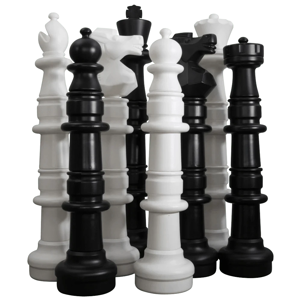 - ONE OF THE MOST POPULAR SETS LARGER THAN LIFE FUN: The Premium 49-Inch Plastic Giant Chess Set is one of the most popular set from MegaChess. It includes 16 black and 16 white pieces. The Giant Chess Pieces range in height from a 49-inch king to a 40-inch-tall pawn. The set can be used both indoors and outdoors and is made with high-quality, long-lasting materials. Chess board is sold separately.